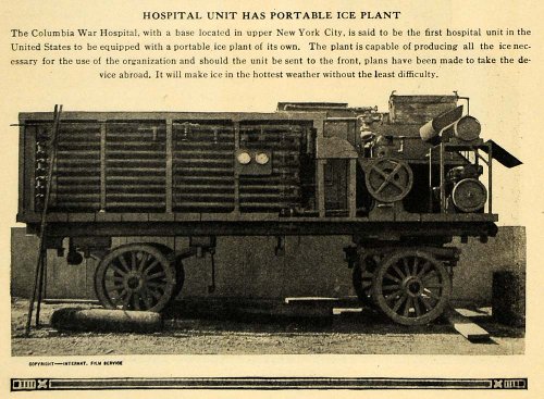This is an original 1918 halftone print of the Columbia War Hospital's portable ice plant in upper New York City. This machine carried and produced ice with very little difficulty. Please note that there is printing on the reverse.
