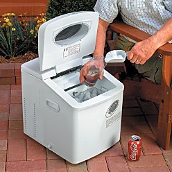 use indoors or outdoors. Commercial-quality portable ice maker starts making ice in less than 10 minutes. No more running of out of ice, when the portable ice maker is on hand. uses either tap or ice water, and has a 1-gallon reservoir. No drain is required so it's safe to use anywhere. No more running out of ice! The portable ice maker lets you make ice quickly whenever you need it. During a party, cookout or get-together, doesn't it always seem as if there's never enough ice? Well now there is! Just plug in this commercial-quality portable ice maker and it will start delivering ice in less than 10 minutes, making up to 35 lbs. of ice in 24 hours, in your choice of 3 sizes of cubes. Now there's no need to run to the corner store for ice. Portable ice makers are ideal indoors or out...wherever there's an electric outlet handy. Our portable ice maker also gives you the option of using tap or bottled water. No drain is required so you can use this ice maker anywhere. Benefits of the Portable Ice Maker: Use indoors or outdoors Uses either tap or ice water, and has a 1-gallon reservoir One less thing to worry about when planning a party